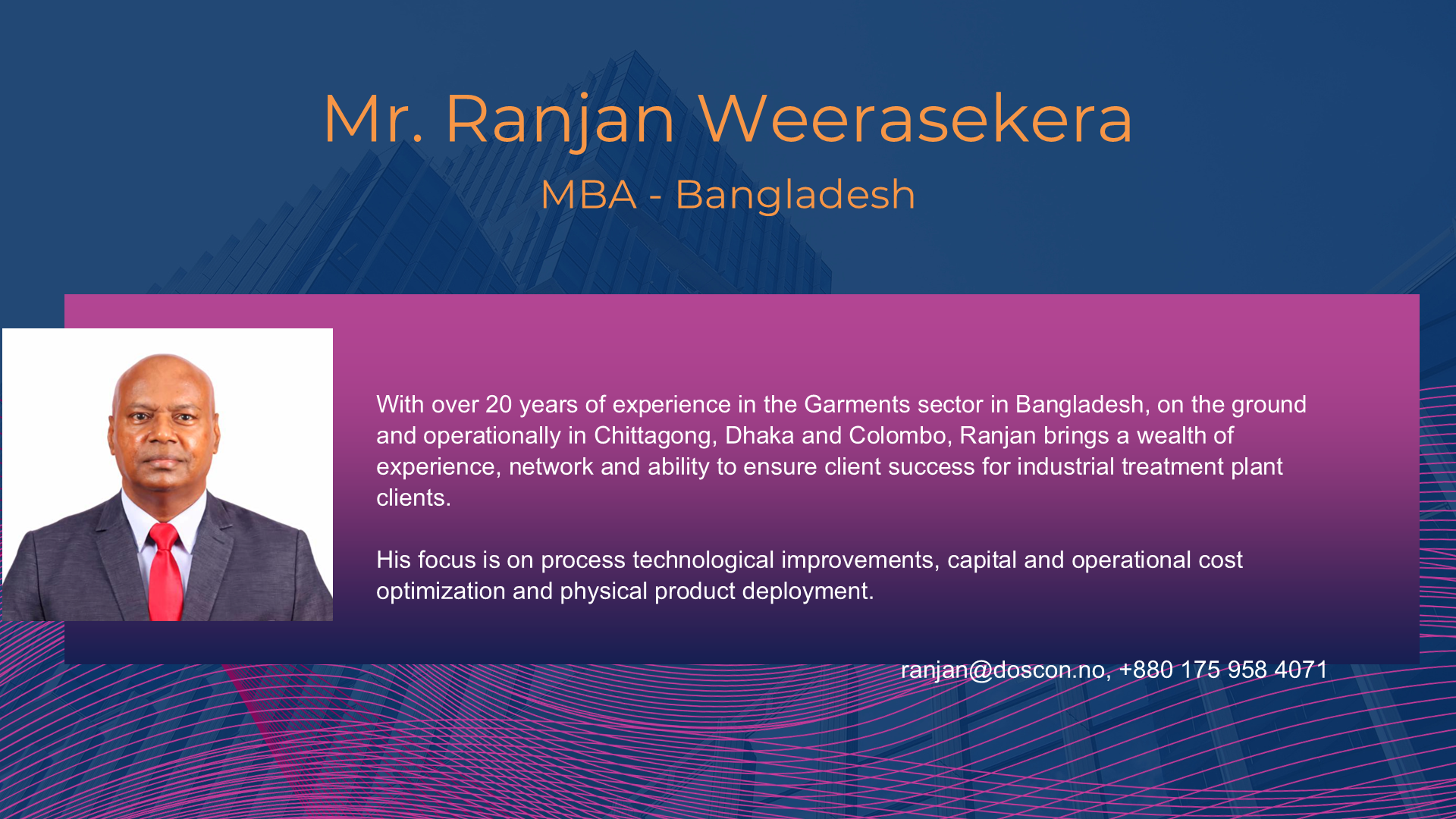 DOSCON has invested a decade of commitment to technical research, development and promotion of intelligent control systems in water treatment operations, by providing solutions to treatment challenges. The chairman and technical director of the company is Prof. Harsha Ratnaweera, a professor at the Norwegian University of Life Sciences. He has overseen the access to partnerships between academic institutes across the world, and industrial solutions provided by DOSCON in Europe and Asia.